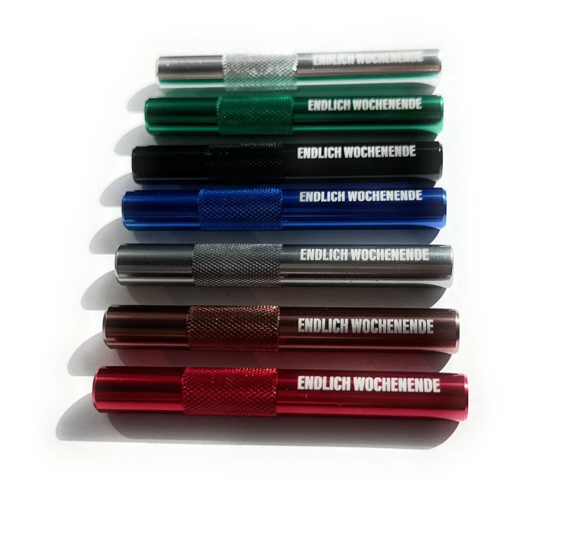 This high-quality aluminum tube with the engraving "Finally Weekend" combines elegant design with thoughtful functionality. The wide diameter ensures optimal intake, while the ribbed grip design provides a secure hold.