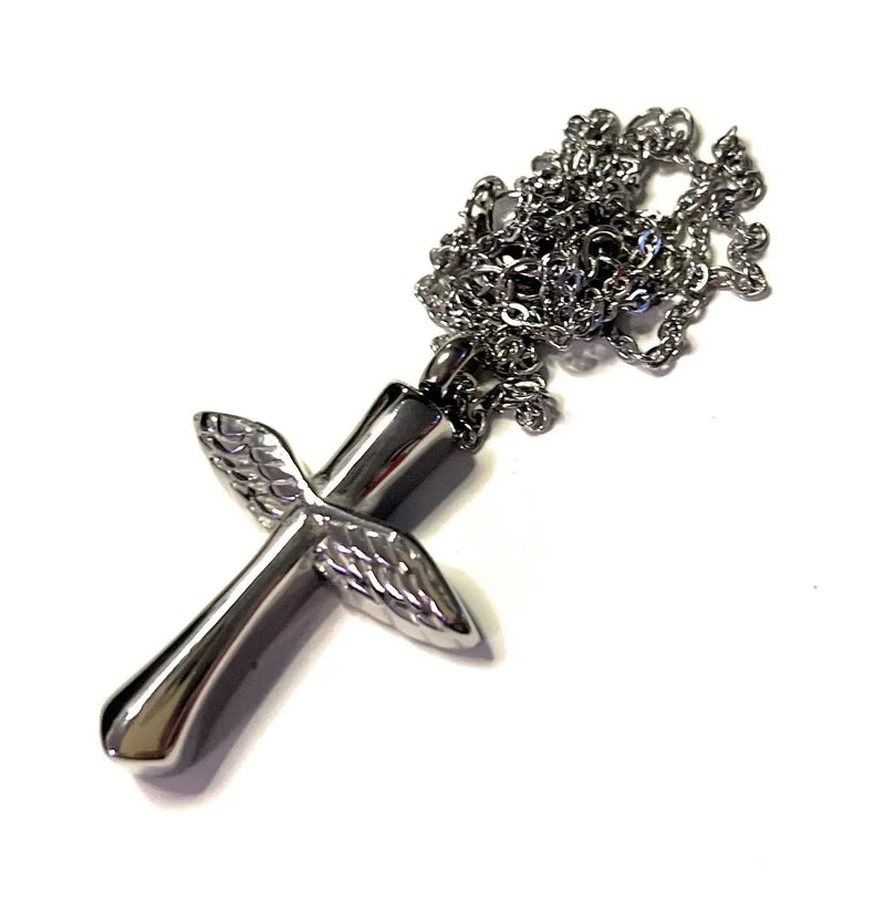 This unique cross necklace with wings made of stainless steel combines style and symbolism with practical functionality. The pendant can be opened and filled, allowing you to securely store small memories or personal items.