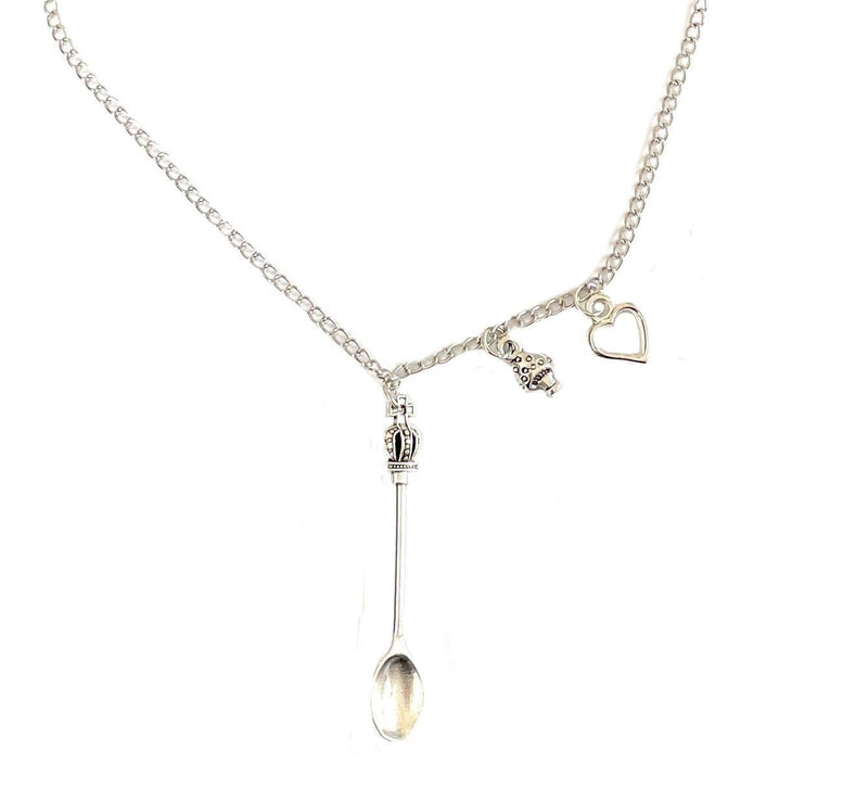 Elegant mini spoon pendant crown and heart/mushroom charms with 45 cm silver necklace