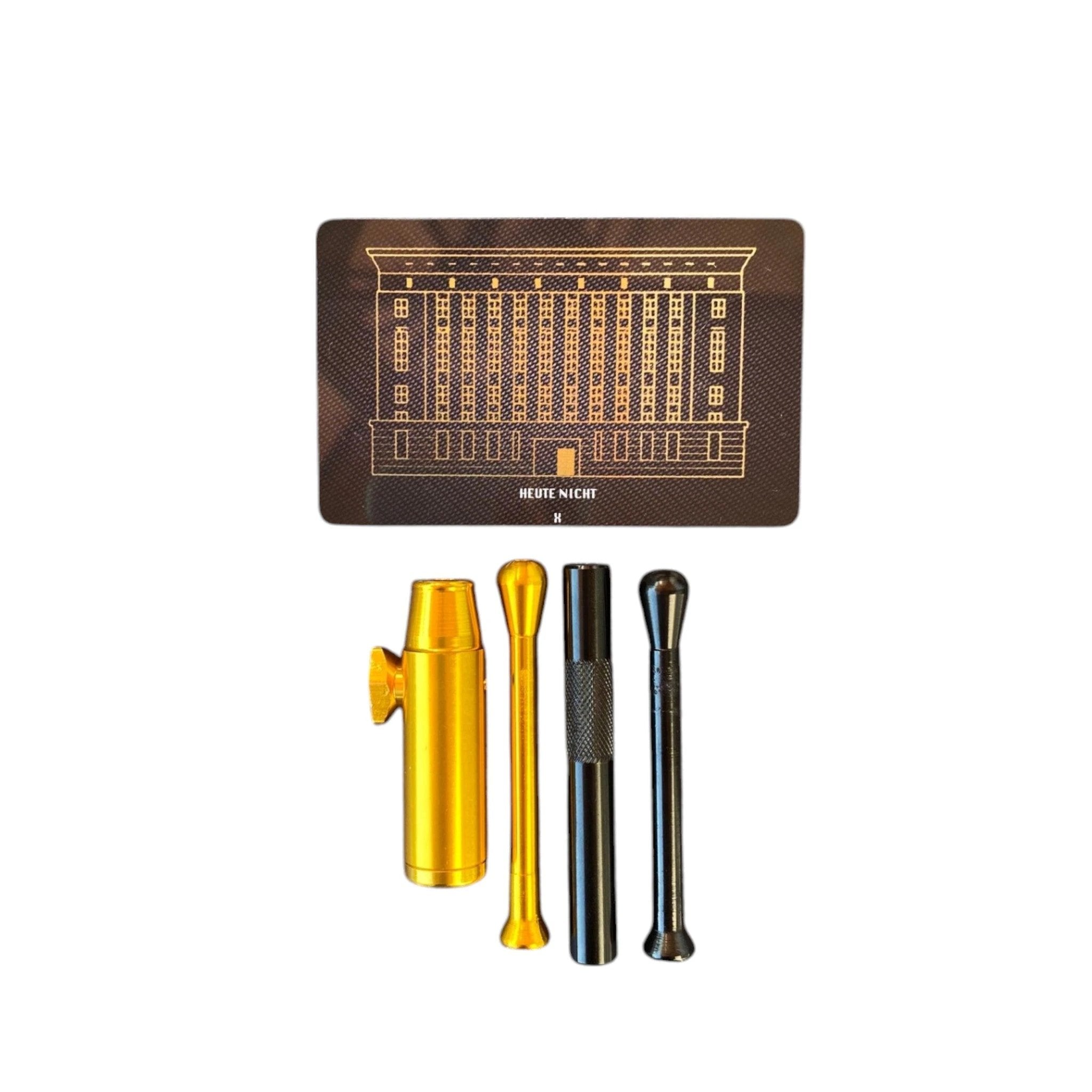 El set "Berghain" combina materiales de alta calidad con un diseño elegante. Con tres tubos decorativos en oro y negro, un dosificador de aluminio en oro y la tarjeta de hackeo Berghain "Hoy no", este set es perfecto para llevar o como un accesorio estiloso.