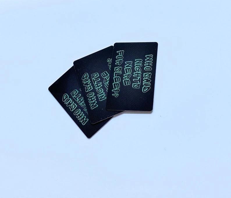 Esta tarjeta de tirón y hacha con un elegante aspecto de carbono con la inscripción "¿Quién dijo que las noches eran para dormir?" combina un diseño de alta calidad con funcionalidad práctica. Fabricada en plástico/PVC resistente, ofrece una alternativa higiénica y duradera a las tarjetas convencionales.