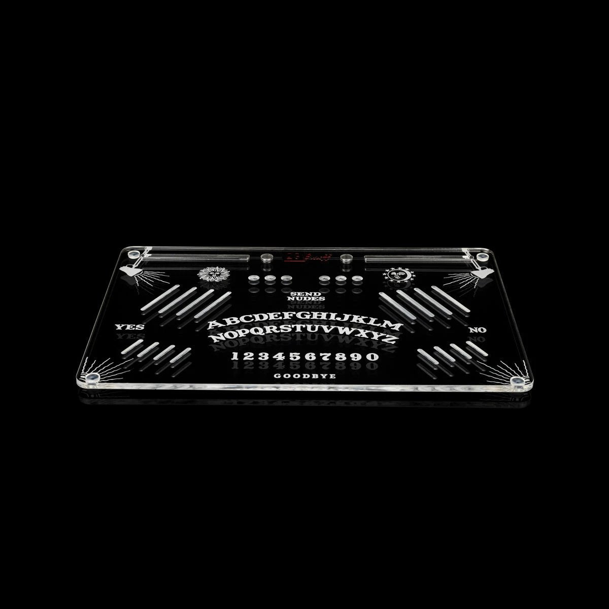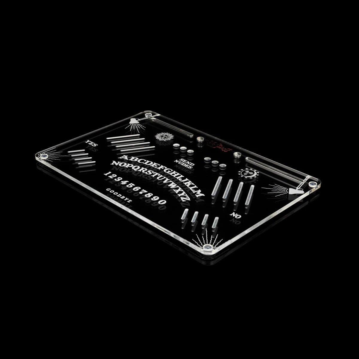 Mystisches Design: Ouija-Motiv fein in die Unterseite eingraviert – sieht nicht nur cool aus, sondern leuchtet bei Beleuchtung mit dem Reflektionspanel richtig auf!