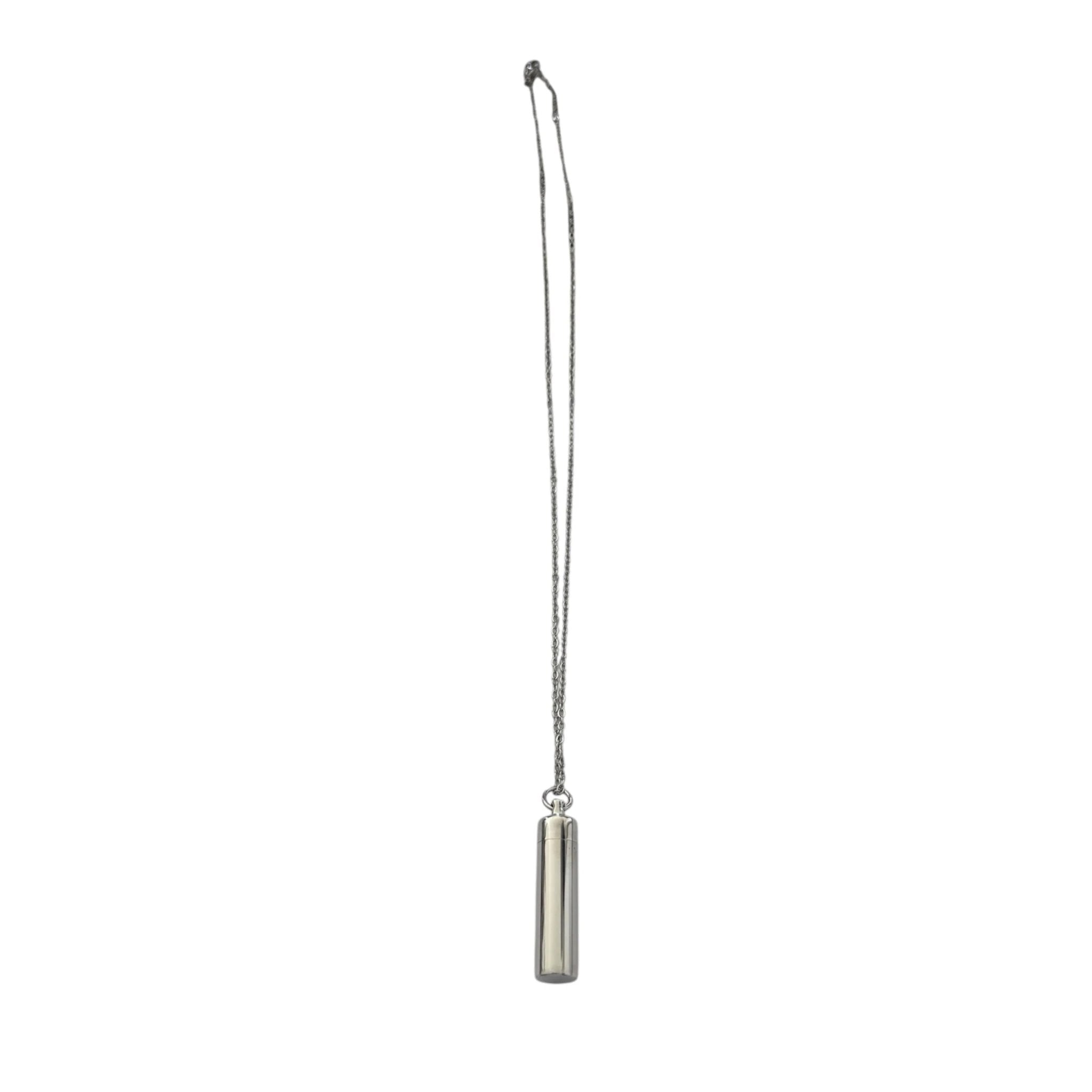 Stylisch unterwegs & dabei alles sicher verstaut: Diese coole Kette mit zylindrischem Anhänger aus Edelstahl bietet Platz für kleine Mengen Pulver oder andere persönliche Dinge. Im Inneren befindet sich ein kleines Glasfläschchen mit Kunststoffdeckel.