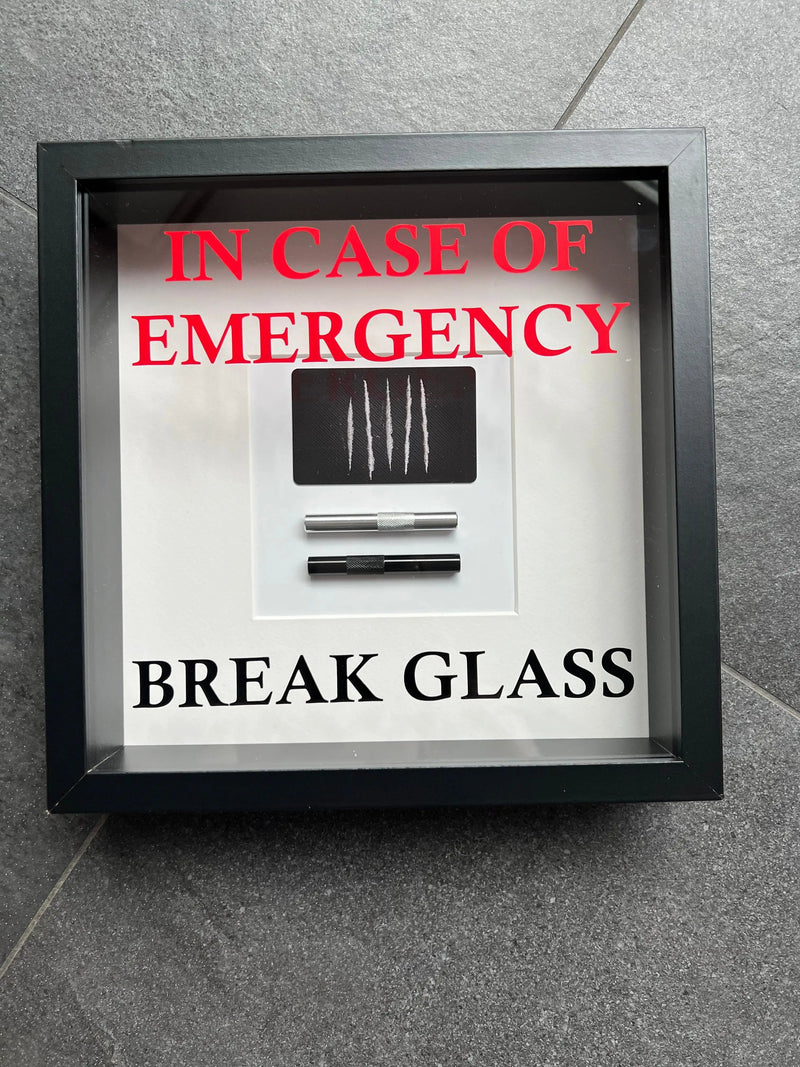 ▫️ 1 x Wandbild „In Emergency – Break Glass“ mit weißem Rahmen